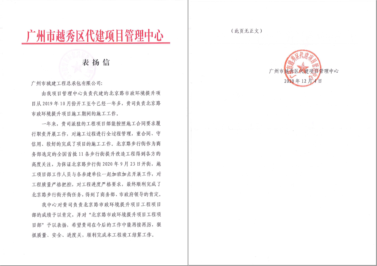12月7日,廣州市越秀區(qū)代建項目管理中心向我公司發(fā)來表揚信,對我公司負責的北京路步行街改造提升項目的施工工作予以肯定和表揚。